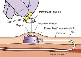 It was the first day using my new appendage, ie my port. Blood draws are always first, so I was called back quickly. First, access to the port is gained. Ok, not fun. She essentially grabs the port access, which is under my skin and holds it while she sticks in a small needle. This was very sore being that this skin had just been cut to put the port in the day before. But, once she finds it, she does one poke and I'm done.